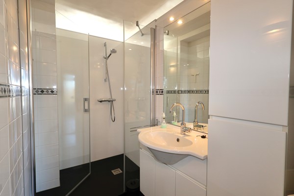 - Bathroom has a shower, bathroom furniture with mirror and design radiator