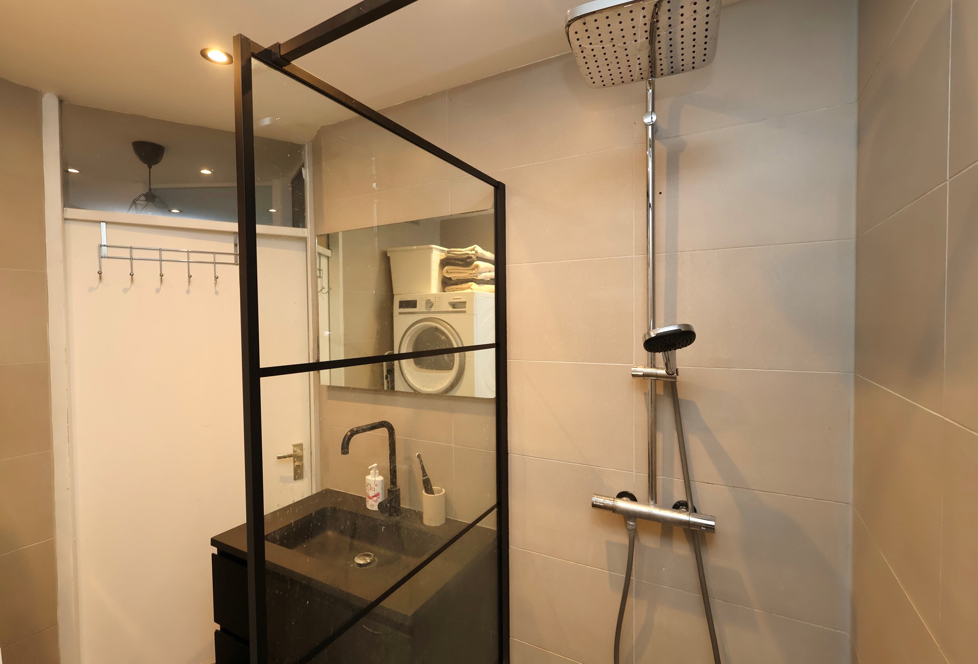 The modern bathroom (approx. 4 m²) includes a walk-in shower, washbasin cabinet, washing machine and dryer.