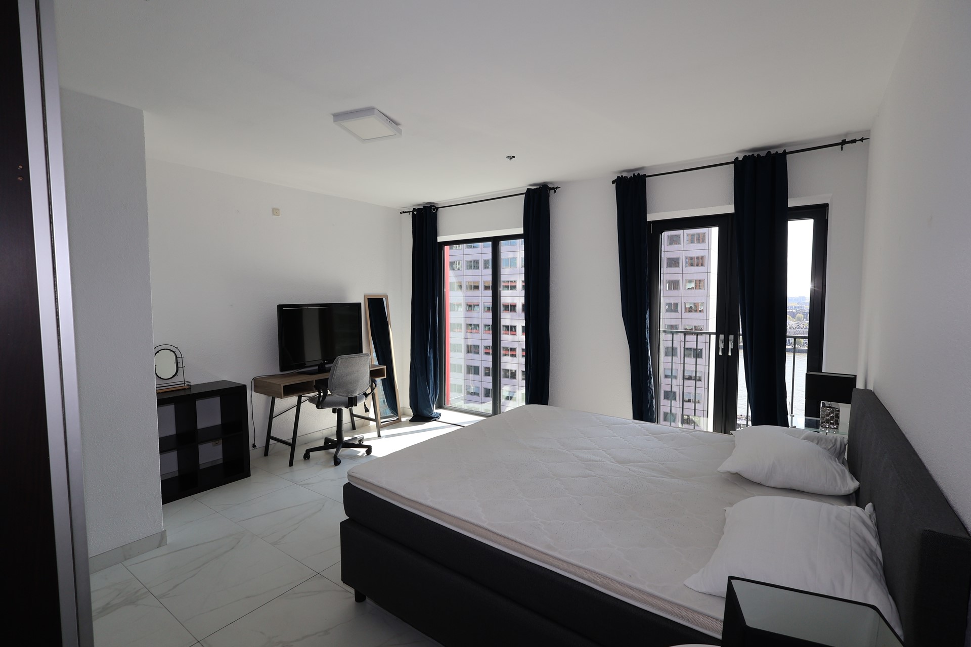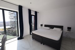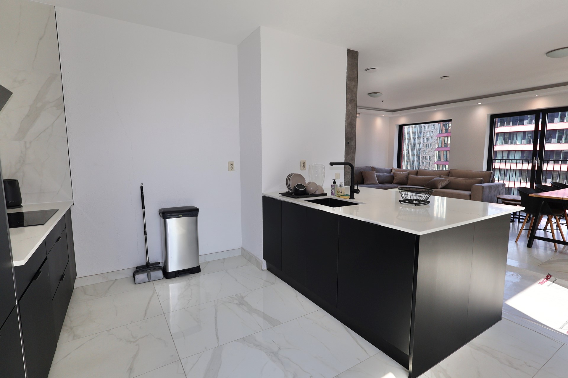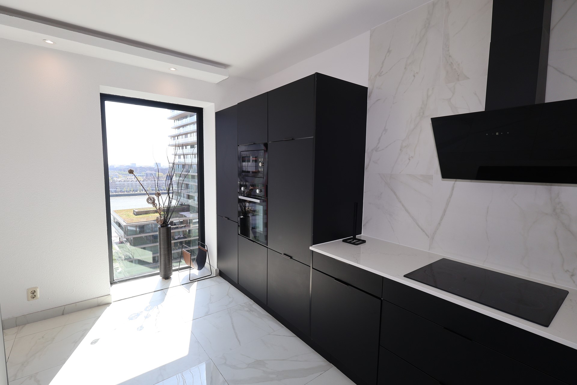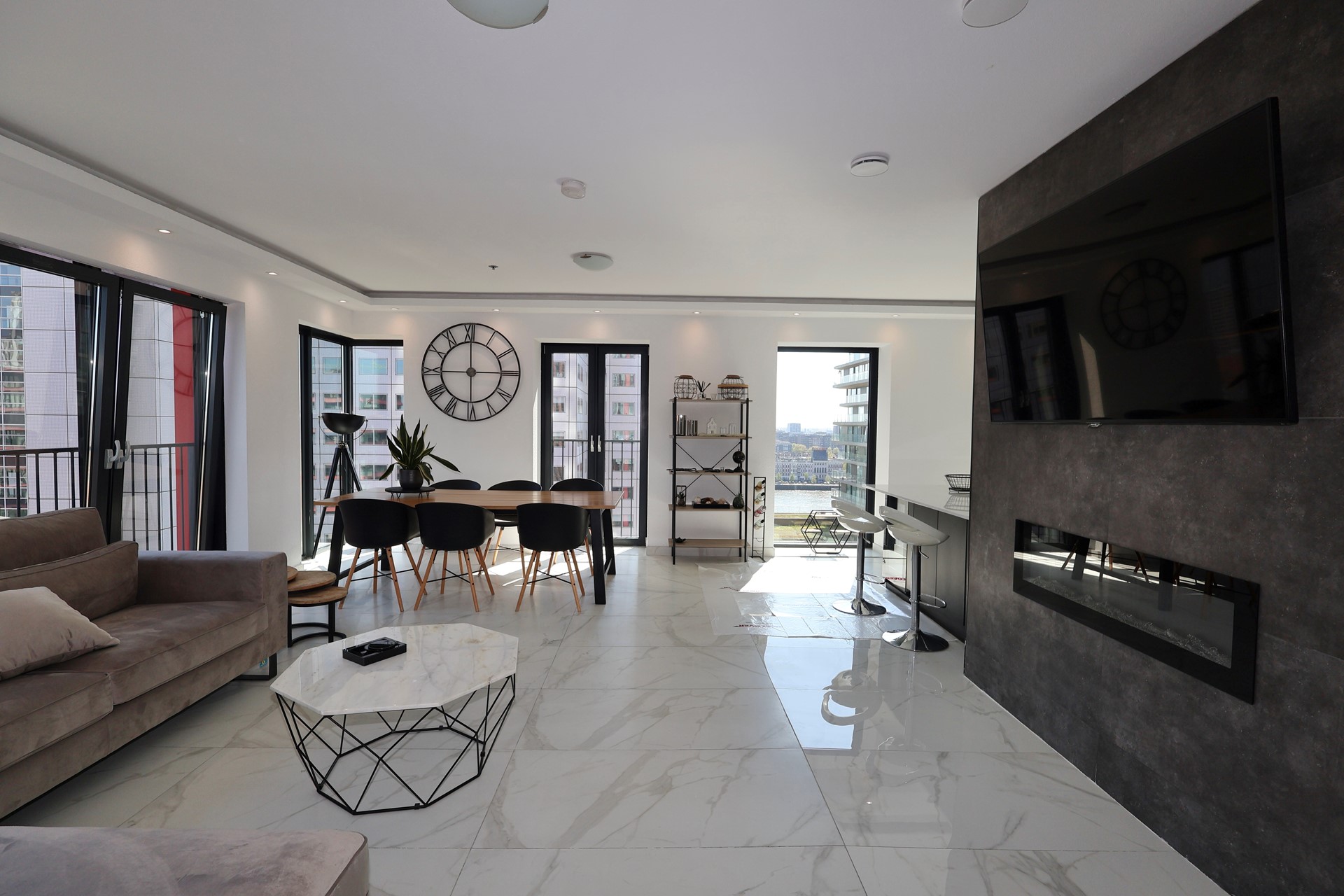 The spacious living room with open-plan kitchen forms the heart of the apartment. Thanks to the large windows and French balcony doors, you can enjoy stunning views and plenty of natural daylight.