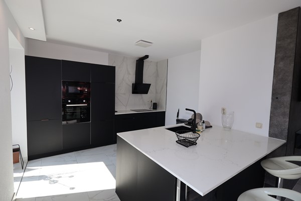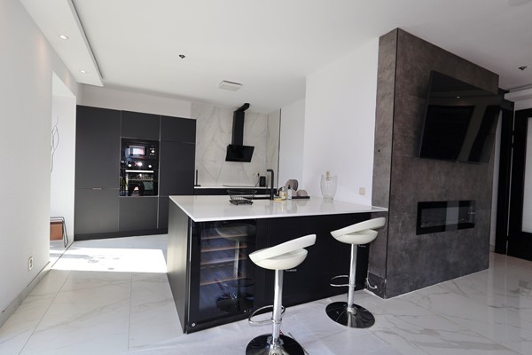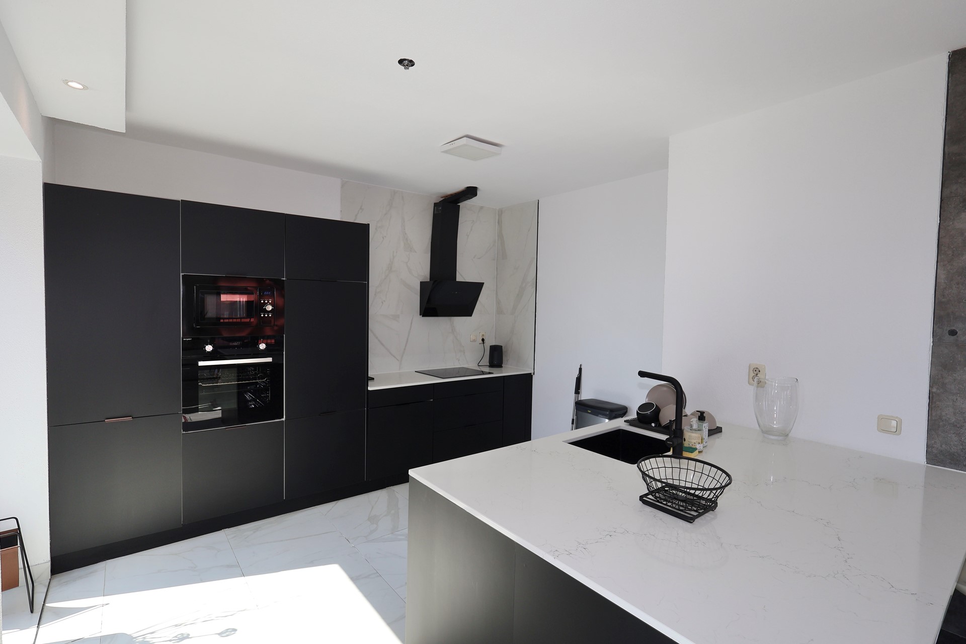 The modern open kitchen features a kitchen island with sink and various built-in appliances, including a 4-burner induction cooktop with extractor hood, oven, microwave, dishwasher, and fridge-freezer combination.