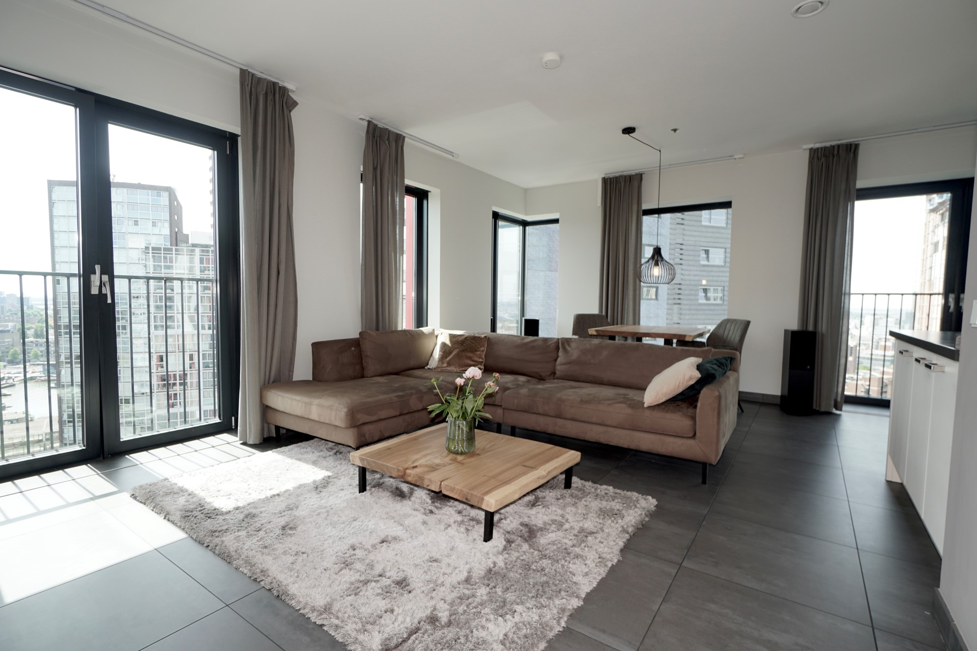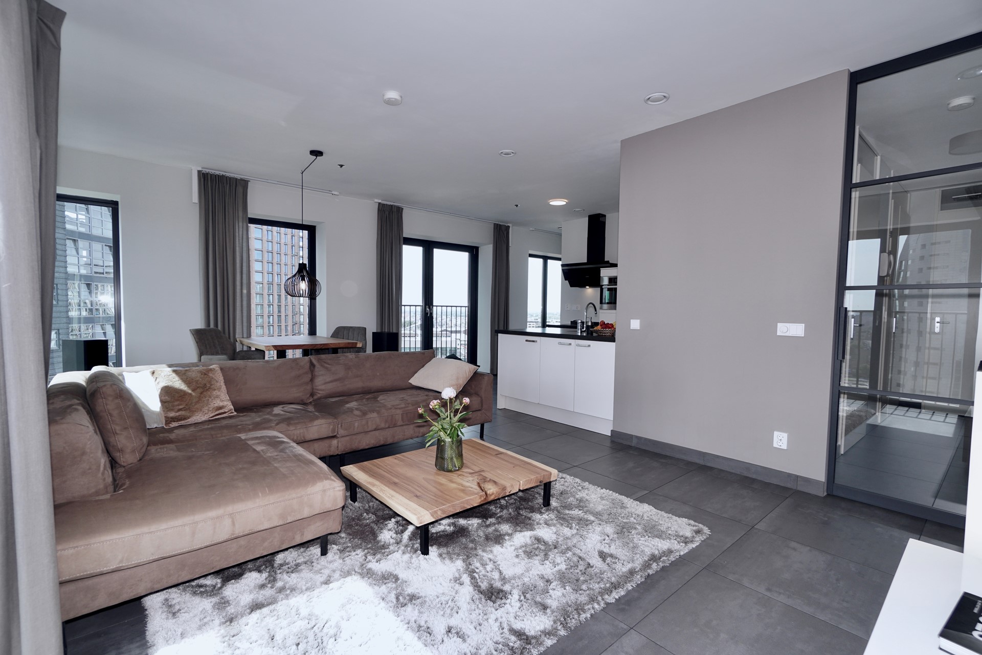 The generous living room with open kitchen forms the heart of the apartment. Large windows and French doors provide plenty of daylight and offer beautiful views over the city.