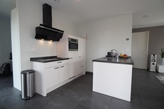 The modern open kitchen features a kitchen island and is equipped with various built-in appliances, including a 4-burner electric hob with extractor, combination oven, dishwasher, and built-in refrigerator.