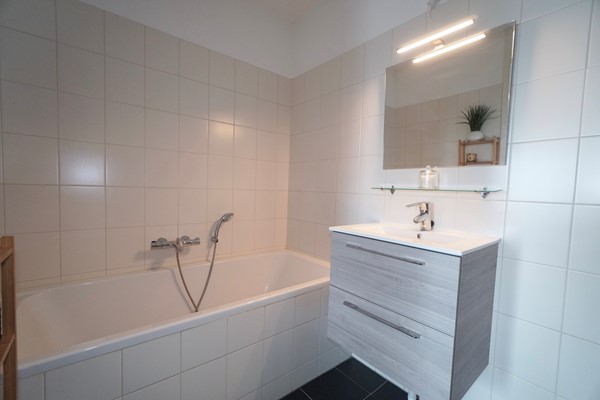 The neat and complete bathroom is equipped with a bathtub, separate shower, washbasin with mirror, and underfloor heating.
